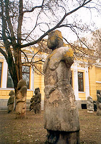 Most inhabitants of the city and visitors know and like the distinctive features of the small square near the Museum of History - the place where the Stony Women stay (which actually are not females...). The visitors are amazed with the centuries-old natives - their oval forms. They were ancient creations of the steppe nomadic people and are a modular collection from neighboring barrows. In the past they served as the index points for the steppe inhabitants. The first century of the new era was marked by fast inhabitation of the Dnieper River banks by Slavic tribes. The rocks of Monastyrskiy Island remember well the first time Slavs floated down the Dnieper River to the Black Sea and the Mediterranean. On this island in the IX century the Monastery was founded by Byzantian monks (from it the island received its name). It existed until 1240 when it was destroyed by Tatars. The Dnieper River has for many centuries served as a border between East and West and its banks have served as arena of struggle between the Slavs and the Asian nomads. This situation continued for many centuries until the XV century when there appeared a new force - the free people - Cossacks - Zaporiz'ki Kazaky (Zaporizhya - the lands south of Prydniprovye, translate as "The Land After the Weirs [Rapids]")...